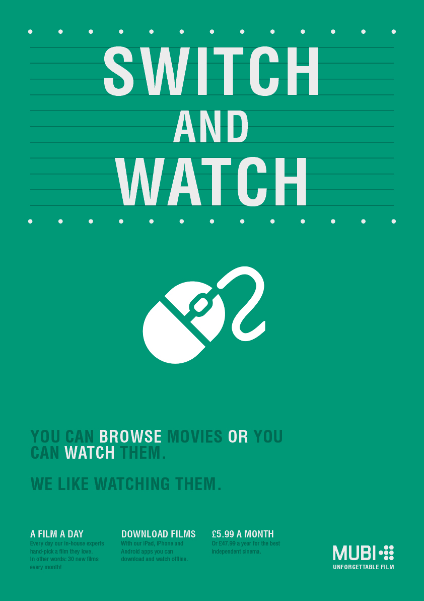 As the body is going to cover this aspects, "switch and watch" was changed for "Mubi Night", which later on was modified to "It's Mubi Night" as the "it's" informs the audience about something that is happening, a title that doesn't necessarily address the problem. Also, "movie night" is a common expression in English to refer to a night at home alone or with close friends to spend a time together watching a movie. I thought about using this as a way to take advantage of this commonly used expression as a way to get the brand into the culture, like it has happened intentionally or accidentally in the past . Some examples are "Netflix and chill", "Just do it", "There are some things money can't buy. For everything else, there's MasterCard", "I'm lovin' it", etc. Everytime someone says "Oh yeah, I'm lovin it" it's impossible not to think in Mc Donald's. The intention with this pun it's to create the same effect.